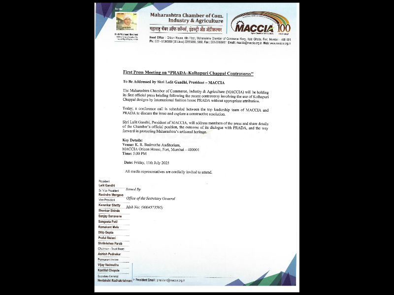 The Maharashtra Chamber of Commerce, Industry & Agriculture (MACCIA) will be holding its first official press briefing following the recent controversy involving the use of Kolhapuri Chappal designs by international fashion house PRADA without appropriate attribution.